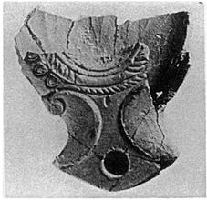 | Description: | Part of front preserved. Broad triangular nozzle with volutes at sides; ovules on rim at side; same line continues across line of nozzle as twisted cord. Similar ridge of twisted cord separates discus from rim. Grooves at outer edge of discus. Flat bottom. Traces of thin red to purple wash. Gritty red-brown clay. Type XXII of Corinth collection. | |