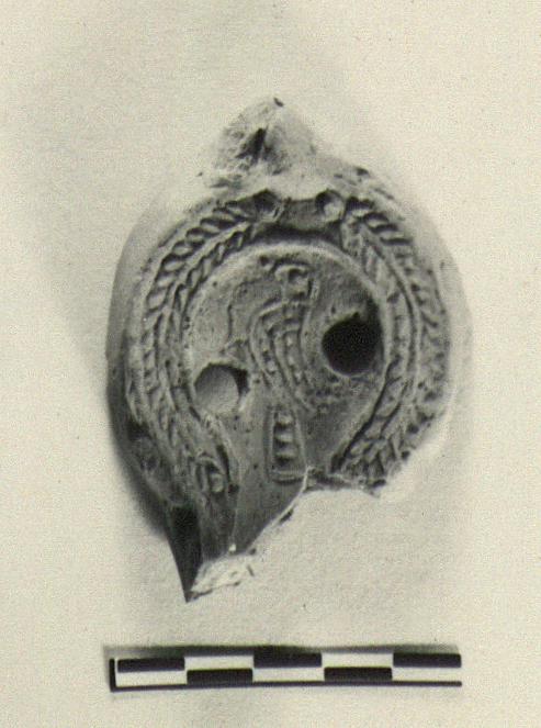 | Description: | The top part only; handle and nozzle missing. Herringbone on rim, bird on disc, lengthwise between two filling holes. Micaceous red clay, brownish at surface. | |