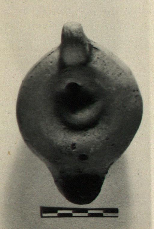 | Description: | Intact. From a very worn mould. On discus, crescent; rim, plain. Handle unpierced; three grooves above and below. On reverse, concentric grooves. Dull red glaze. Type XXVIII of Corinth collection. | |