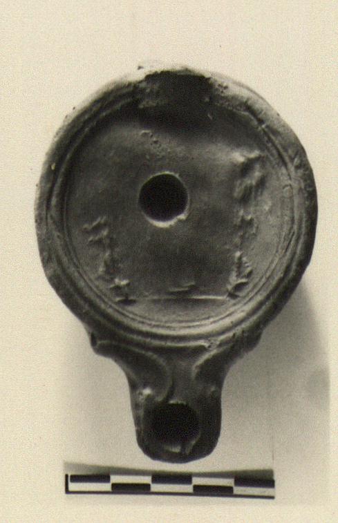 Shallow body, flat bottom with "alpha" in relief; volutes at nozzle. Flat discus, slightly lower than very narrow grooved rim. Relief on discus apparently not fairly stamped.