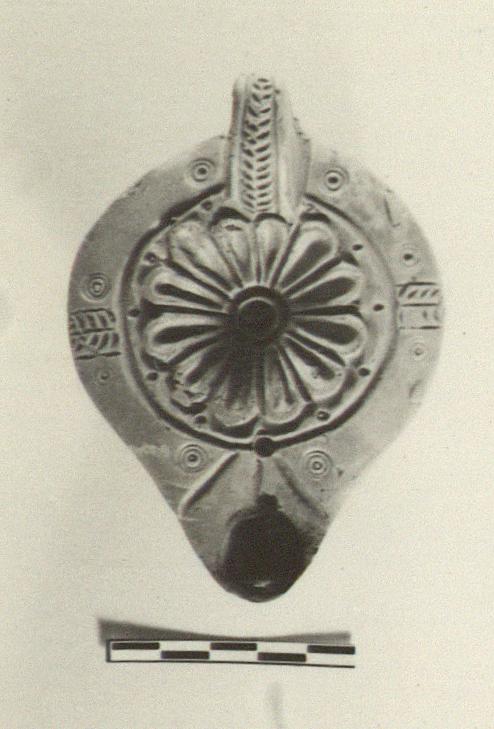 | Description: | Intact. Herringbone panels on rim, and stamped circles. Rosette on discus; solid handle with herringbone on front, double grooves behind. Heart-shaped reverse outlined in a grooved line; at top two stamped circles. Within, incised "alpha". Thin red glaze. Red clay. Type XXVIII of Corinth collection. | |
