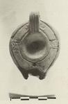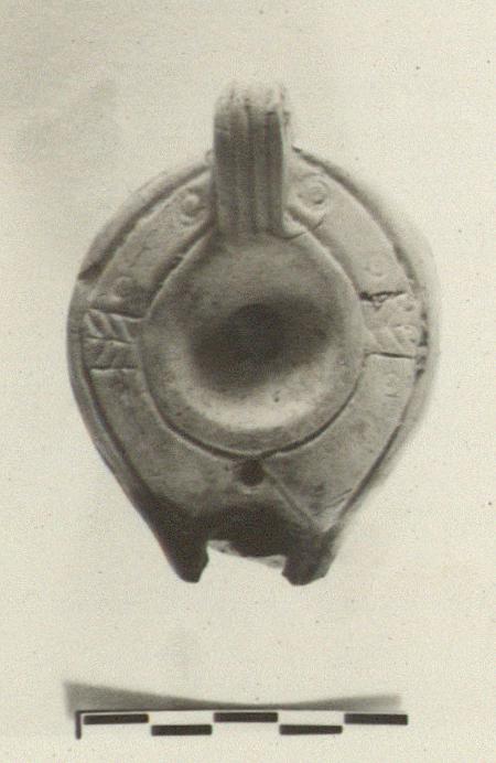 | Description: | Intact except for end of nozzle. Rim with herringbone panels and stamped circles. Plain discus; solid handle triply grooved in front and doubly behind. Circular reverse with circular groove enclosing letters "K Y". The lamp seems to have been used after the nozzle was broken. Slight traces of thin red wash or glaze (?). Light red clay. Type XXVIII of Corinth collection. | |