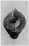 | Description: | Intact except for chips. Wavy lines on rim, plain discus; solid handle doubly grooved in front and singly behind. Almond-shaped reverse with double grooves and a stamped circles at either end. Within, cross-hatched grooves. Traces of thin red wash (?). Light red clay. Type XXVIII of Corinth collection. | |