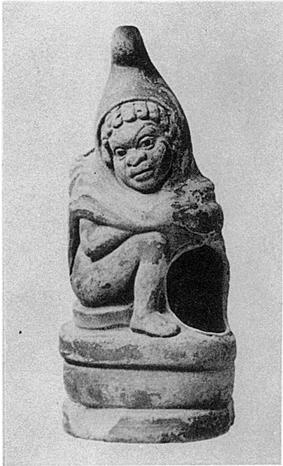 | Description: | Nozzle broken away. A crouching negro boy wearing a hooded cloak, the cloak thrown over his shoulder. High oval base; filling hole behind head; hood pierced to serve as handle. Red glaze, rather flaked. Buff clay. | |