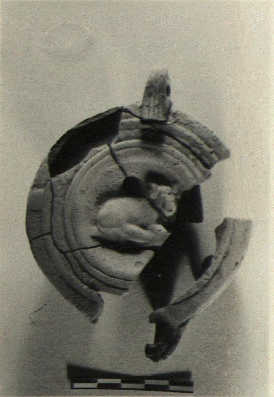 | Description: | Mended from many fragments; much of right side missing; fragment of rim and nozzle does not join. On discus, cow lying down. On rim, outer part plain with panels; inner, spirals. Reverse, low foot ring, within which traces of signature. Handle pierced, three grooves above and below. Pinkish to buff clay. Type XXVII of Corinth collection. | |