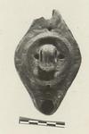 Suspension type lamp with central vertical handle, and a nozzle on either end. Plain rim, with traces of panels (?). Plain discus with notched edge all around. Two filling holes. Pierced handle, doubly grooved. Almond-shaped reverse, enclosed by double grooved lines.