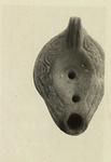 | Description: | On rim, wavy lines. Discus, plain, almond-shaped, with small central filling hole and rather large air hole. Nozzle plain. Handle solid, double grooved. On bottom, double almond-shaped groove, enclosing a cross with hatched arms. Unglazed. Pinkish-buff clay, grayish at surface. Type XXVIII of Corinth collection. | |