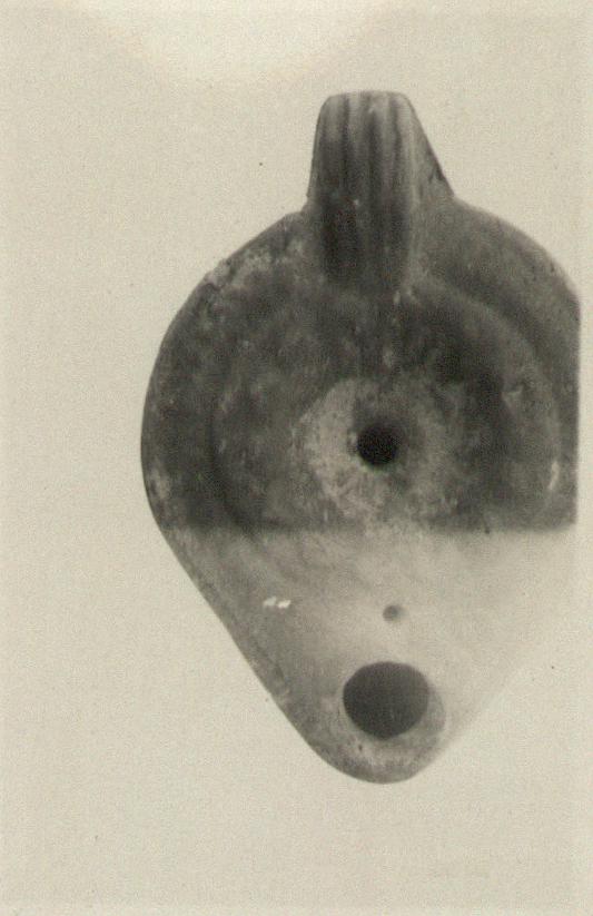 | Description: | On rim, herringbone. On discus, rosette with pointed petals; sinks sharply in center to small central filling hole. Nozzle plain, set off from rim by single diagonal groove on either side. Handle solid, triple grooved. On bottom, small double concentric groove. Thin purplish-red wash. Buff clay. Type XXVIII of Corinth collection. | |