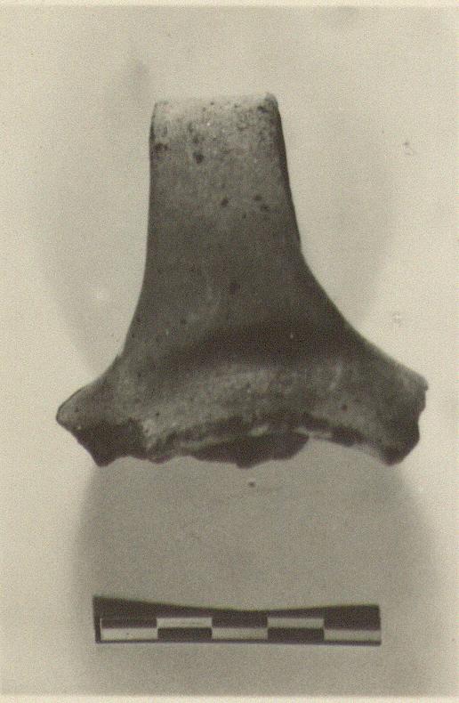 | Description: | Fragment from the back, with heavy vertical loop handle. Flat bottom; rising rim. Coarse brown micaceous clay, much blackened. Type 2B of Agora collection. Early Attic. | |