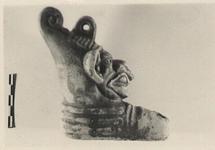 | Description: | Intact. Grotesque head in a peaked cap; floppy ears, slobbery lips, and crooked nose. Pierced grooved handle on the cap; filling hole between the handle and the peak of the cap. Poor red to brown glaze. Buff clay. | |