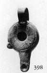| Description: | Tip of nozzle, handle, side knob missing. Concave bottom, marked off by a groove; shallow nearly straight sides, broad flat rim with groove at outer edge. Vertical strap handle, pierced side knob. Long nozzle. Blister ware or unguentarium fabric. Hard dark gray clay; slightly lighter gray surface. Type IX of Corinth collection, type 28A of Agora collection. | |