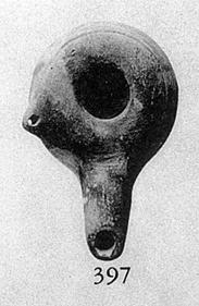 | Description: | Intact. Similar to L 3524 (Ω 816), but the walls higher and straighter, and the groove at the outer edge of rim, not around filling hole. Thin gray wash. Buff clay. Type IX (blister ware) of Corinth collection, type 28A of Agora collection. | |