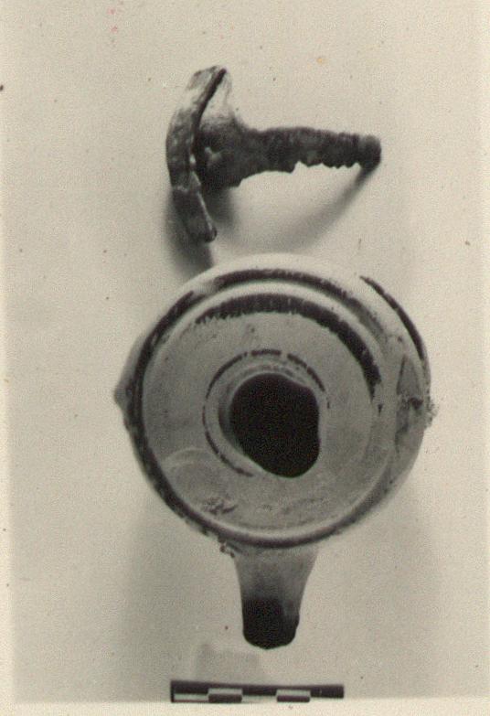 | Description: | Chips missing, and knob at side broken. Low base, deep rounded body set off from convex rim by groove at outer edge. Pierced side knob; short small nozzle. Unglazed, except for three bands of black around rim, and black glaze inside. Pinkish-buff clay. Type VIII (domed variety) of Corinth collection, type 25C' of Agora collection. Part of lead holder still clings to lower wall, and a non-joining piece from rim of holder, with a high vertical strap handle, probably belongs. Cf. T 7. | |