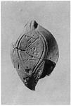 | Description: | Nozzle broken. On rim, herringbone with globules. Almond-shaped discus, surrounded by groove. Central filling hole surrounded by groove. Four air holes. Handle semi-pierced, double grooved, set off from body by grooves. Nozzle, rounded, set off by double grooves (?). Bottom surrounded by almond-shaped groove. Unglazed. Reddish-buff clay. Type XXVIII of Corinth collection. | |