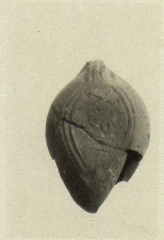 | Description: | Nozzle broken. On rim, herringbone with globules. Almond-shaped discus, surrounded by groove. Central filling hole surrounded by groove. Four air holes. Handle semi-pierced, double grooved, set off from body by grooves. Nozzle, rounded, set off by double grooves (?). Bottom surrounded by almond-shaped groove. Unglazed. Reddish-buff clay. Type XXVIII of Corinth collection. | |