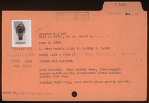 | Description: | Intact but chipped. Flat raised base, flat-topped, square-ended nozzle, horizontal strap handle; narrow flat rim. Poor black glaze partly peeled. Pinkish-buff clay. Type IV (Poor Relations Group, late variety) of Corinth collection, type 30B of Agora collection. | |
