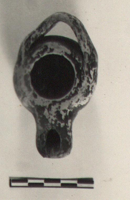 | Description: | Intact but chipped. Flat raised base, flat-topped, square-ended nozzle, horizontal strap handle; narrow flat rim. Poor black glaze partly peeled. Pinkish-buff clay. Type IV (Poor Relations Group, late variety) of Corinth collection, type 30B of Agora collection. | |