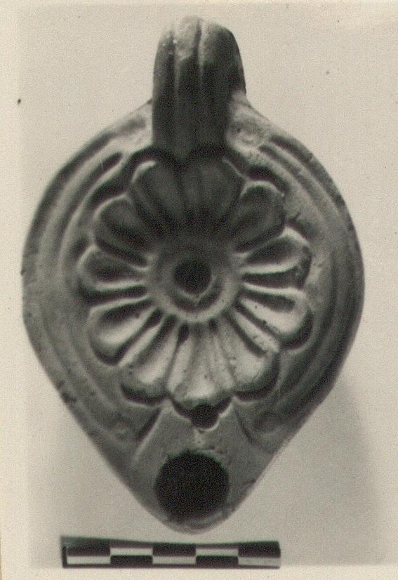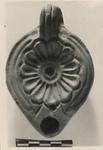 | Description: | Intact. Rosette on discus, rim grooved, with small impressed circles beside handle and nozzle. Rosette of impressed rings on the bottom within two concentric grooves. Handle double-ridged above and below. Unglazed. Light red to brown clay. Type XXVIII of Corinth collection. | |
