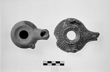 | Description: | Intact, except for chip from nozzle. Shallow spreading variety; pierced lug on side; no handle. Low ring foot. Top slightly concave; nozzle fluked. Dull black glaze, much peeled. Wheel made. Yellowish clay. Type XII of Corinth collection, type 33A of Agora collection. | |