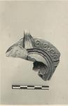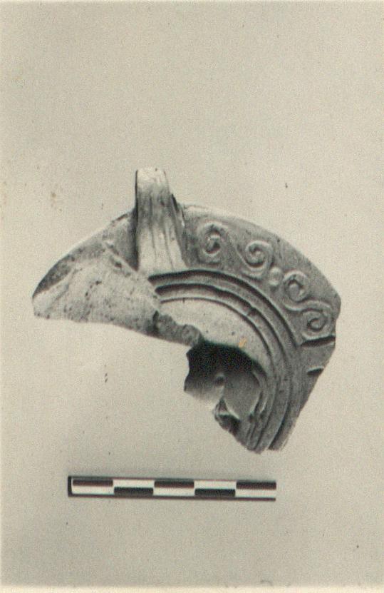 | Description: | Handle and a small part of the base, rim and discus. On rim, spirals and panels. Handle semi-pierced, double grooved. On discus, a bull to left. Underside, within a single circle a trace of a signature. Unglazed. Gritty gray clay. Type XXVIII of Corinth collection. | |