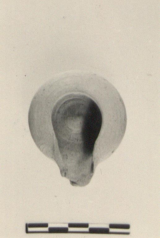 | Description: | Nozzle chipped. Miniature lamp. Flat slightly raised base, left rough; low sharply rounded wall rising abruptly to plain rim. Short broad unbridged nozzle. Unglazed. Pinkish-buff clay. Type 8 of Agora collection. | |