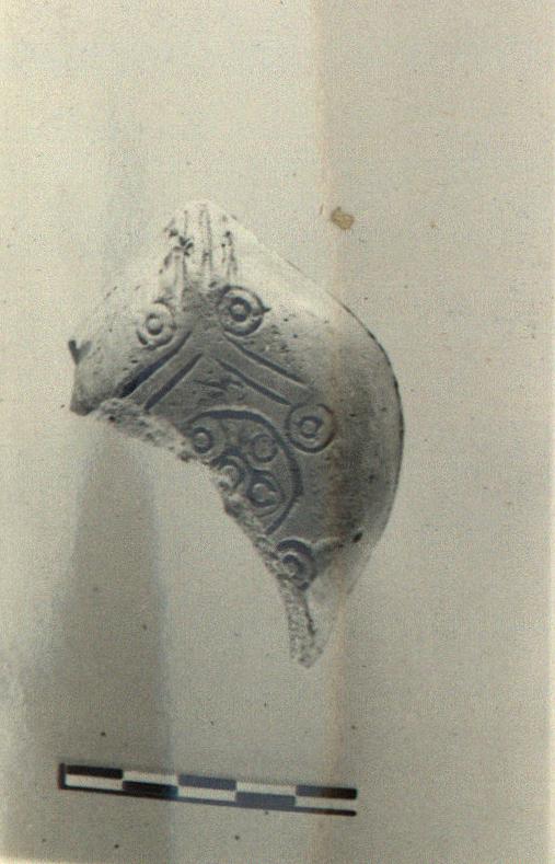 | Description: | Nozzle and front half of body missing. On discus, rosette. On rim, herringbone and small impressed circles. Handle, partly broken, unpierced; three grooves above and below. On reverse, a rosette made up of small impressed concentric circles; larger pairs of similar circles around. Double grooves from base of handle. Unglazed. Reddish-brown clay. Type XXVIII of Corinth collection. | |