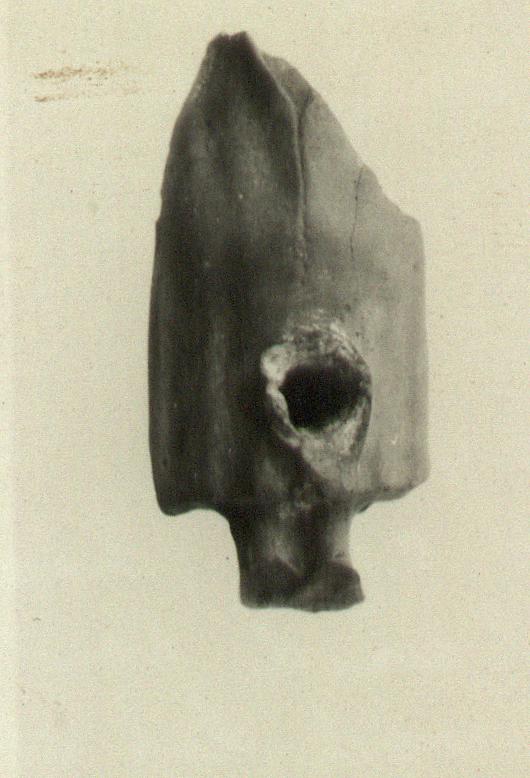 | Description: | Lower part of "Telesphoros" lamp. Back left plain, with a little of lower part preserved. Figure broken at ankles and a little below the neck; nozzle also broken away. Figure muffled in cloak, with opening down front, reaching nearly to wick hole, sewed up, showing stiches. A swelling, perhaps hands clasped under cloak, shows just above the hole for the nozzle. Pinkish-buff slip. Pinkish clay, very micaceous. | |