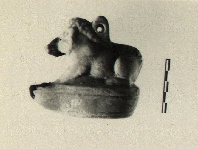 | Description: | Intact except for cracks. A boar, sitting on his haunches, his head turned slightly to one side; an elongated oval base serves as infundibulum, the nozzle under the boar's snout. Pierced ungrooved handle missing from the back of the animal's neck. Two grooves around base, the animal's eyes pierced. Filling hole at side. Matte red glaze. The nozzle and the boar's snout blackened from use. Brownish-red clay. | |
