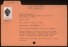 Raised globules on rim and lower wall; ridges around filling hole. Pierced handle with four grooves on the front.