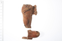 | Description: | The head and the right foot with most of left side of oil reservoir missing. The figure stands draped, wearing a wide girdle which confines the fringed ends of a stole. In the right hand it holds a long-handled rattle against the breast, in the left it holds a torch vertically, a little away from the body. A small oval base, grooved around, serves as infundibulum. The round nozzle projects at the side. Thin glaze, red wash inside reservoir. Buff clay. | |