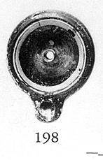 | Description: | Complete except for chips from side. Body, shoulder and rim form one continuous curve; rim slopes down toward center. Broad blunt nozzle; no handle. Short hollow vertical tube rising from floor; slightly raised base. Good black glaze, worn in spots, inside and out; rim unglazed except for thin band of glaze-paint on reserved surface; bottom unglazed. Type IV of Corinth collection, type 22B of Agora collection. | |