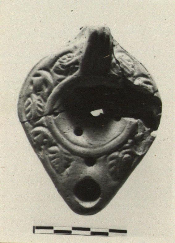 | Description: | Mended from several pieces; fragments missing. Vine pattern on rim; plain discus; solid handle, double grooved above and below. On reverse, double heart-shaped grooves, ending in small circles at the base of the handle. Within, a cross; circles between the arms. Type XXVIII of Corinth collection. | |