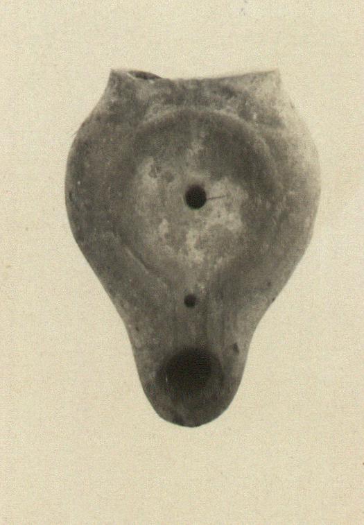 | Description: | Back part of lamp and end of handle broken away. Rim, plain at sides; double concentric semi-circles on either side of channel from discus to wick hole; at back, below handle, remains of vine pattern (?). Discus, plain, sharply concave, with central filling hole. Very long nozzle, with channel set off by ridges from rim; air hole in channel. Handle, apparently 0.045m. wide. On bottom, double grooved, almond-shaped, enclosing signature. Unglazed. Pink clay. Type ΧΧVIII of Corinth collection. Cf. Corinth IV, ii, no. 979, pl. XXXII. <graphic> | |