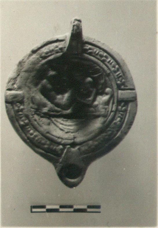 | Description: | On discus, erotic scene. Panelled rim with reel and trefoil pattern. Handle semi-pierced; double grooved on top and bottom, clover leaf at base of handle. Signed in raised letters within two concentric grooves forming low ring foot. Yellowish-buff slip, badly worn. Orange clay. Type XXVII of Corinth collection. <graphic> | |