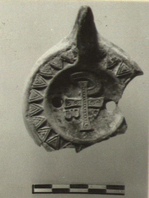| Description: | Most of upper body and handle; nozzle and bottom broken away. Triangular rim; Christian monogram with "alpha; and "omega" on discus. Red glaze. Type XXXI of Corinth collection. | |