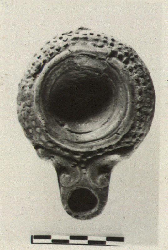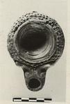 | Description: | Handle missing; otherwise intact. Typical globules and volutes; on the bottom, the typical "alpha". Red to dark brown glaze. Type XX of Corinth collection. | |