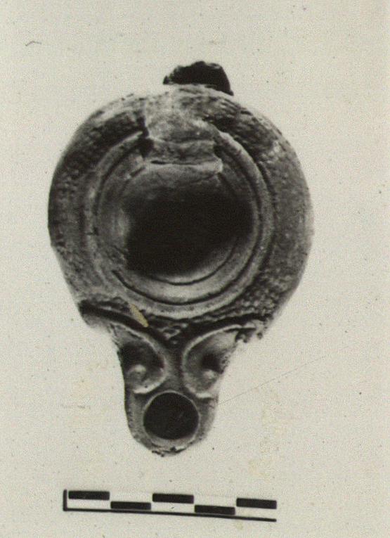 | Description: | Handle missing; mold fairly worn. Typical globules, very small; on the reverse the typical "alpha". Dull dark gray to brown glaze. Brownish clay. Type XX of Corinth collection. | |