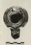 | Description: | Handle missing. Rather broad high ridge around discus; typical globules and "alpha". Worn red to dark brown glaze. Light red clay. Type XX of Corinth collection. | |