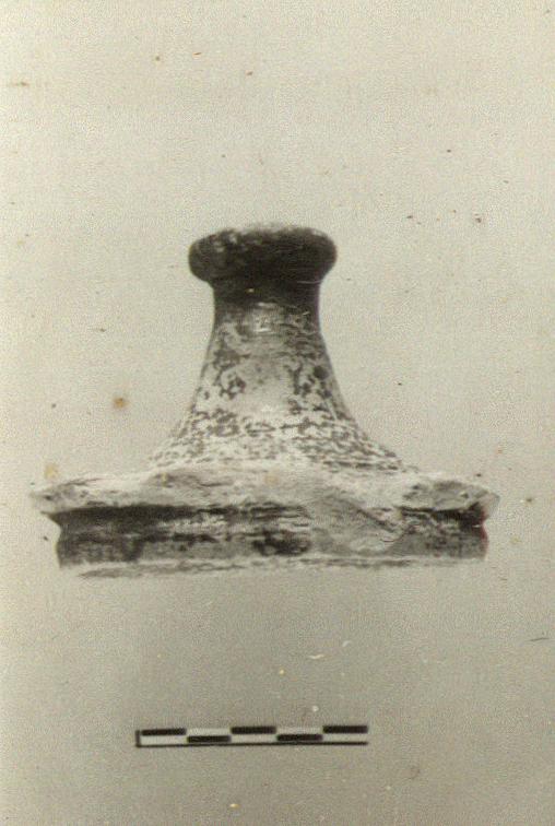 | Description: | The heavy raised base and the vertically pierced conical cone preserved; walls entirely missing. The top of the cone is finished with a rounded projecting knob. Black glaze considerably chipped, all over. Light reddish-buff clay. Type 26A of Agora collection. | |