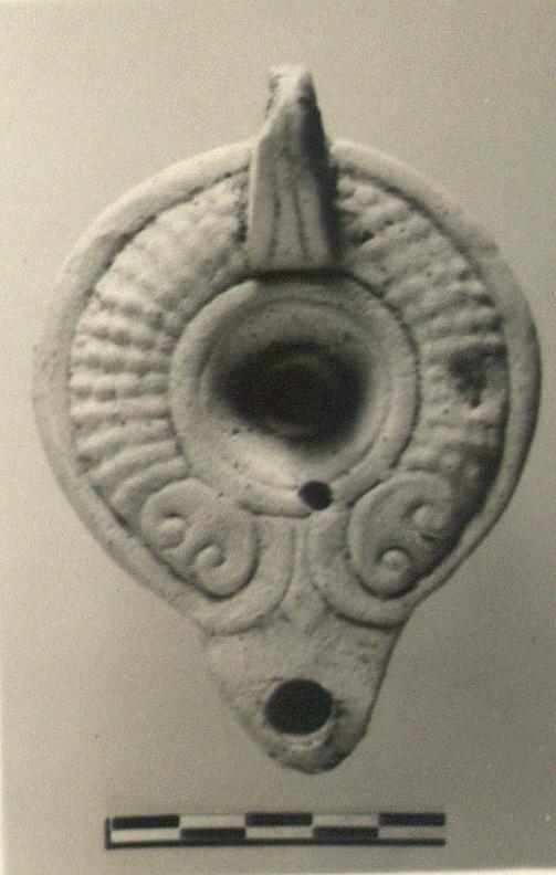 | Description: | Complete. Plain sunken disc; raised dots on rim and debased volutes either side of nozzle; larger raised dots on lower wall; handle pierced and double grooved, top and bottom; five raised dots on reverse within circular bands, all within groove and ring. No glaze. Light buff clay; slightly micaceous clay. Type XXVIII of Corinth collection. | |