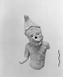 | Description: | Preserved from waist up, right hand, left arm and end of nose missing. Male figure, nude except for strap over right shoulder, and high stocking cap with end turned forward. Pierced eyes, large flat nose, open mouth with tongue stuck out. Traces of blue paint above left eyebow (?). Dull red wash. Slightly micaceous yellow-buff clay. | |