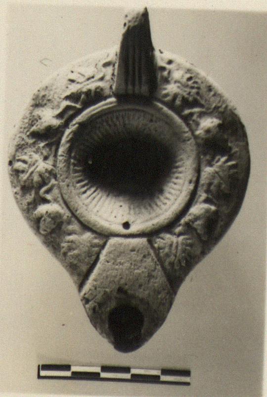 | Description: | Intact. Grape vine on rim, rays on disc, heart-shaped leaf in relief on bottom within circular groove. Pierced handle, triple grooved in front, double behind. Traces of yellow-brown on surface: glaze or iron-stain (?). Light buff clay. Type XXVII of Corinth collection. | |
