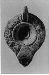 | Description: | Intact. Grape vine on rim, rays on disc, heart-shaped leaf in relief on bottom within circular groove. Pierced handle, triple grooved in front, double behind. Traces of yellow-brown on surface: glaze or iron-stain (?). Light buff clay. Type XXVII of Corinth collection. | |