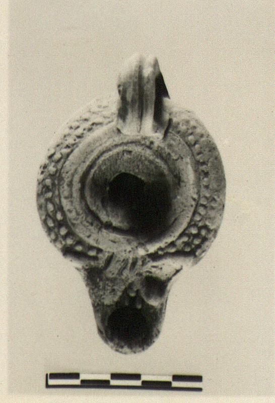 | Description: | Intact. Typical globules on body and top; the volutes at the nozzle are represented only by smears. Typical "alpha" below. Black glaze preserved on in a few spots. Dirty brown clay. Type XX of Corinth collection. | |