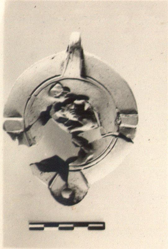 | Description: | Mended from several pieces, fragments of top, walls, walls and reverse missing. On discus, emaciated grotesque figure, seated with legs to left, head turned back to right. Rim plain, panelled, pierced and doubly grooved top and bottom. On reverse, within circular groove, the incised signature. No glaze; thin fabric. Light pinkish-buff clay. Type XXVII of Corinth collection. <graphic> | |