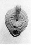 | Description: | Intact. On discus, whirling rosette; on rim, herringbone; handle unpierced, doubly grooved top and bottom; on reverse, two concentric circles. Unglazed. Good brick red clay. Type XXVIII of Corinth collection. | |