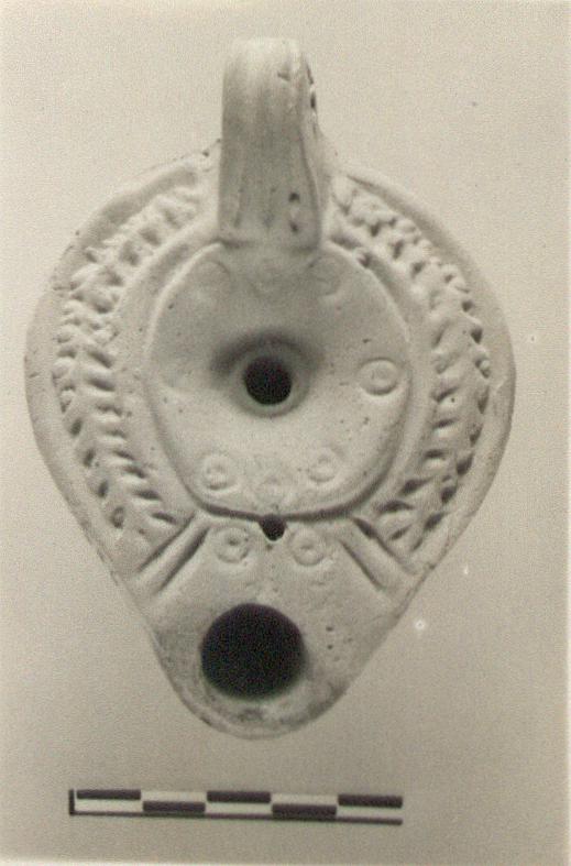 | Description: | Intact. On discus, groups of small impressed circles with dots. On rim, herringbone; handle, unpierced, three grooves above, two below. On reverse, within two oval grooves, a signature. No glaze. Buff clay. Type XXVIII of Corinth collection. <graphic> | |