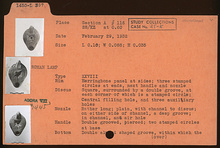 | Description: | Fragment of rim and side preserved. On rim, herringbone panel at sides; three stamped circles at ends, next handle and nozzle. Discus square, surrounded by a double groove, at each corner of which is a stamped circle; central filling hole, and three auxiliary holes. Nozzle rather long; plain, with channel to discus; on either side of channel, a deep groove; in channel, an air hole. Handle pierced, double grooved; two stamped circles at base. On bottom, double almond-shaped groove, within which the signature. Thin dull red wash. Orange clay. Type XXVIII of Corinth collection. <graphic> | |