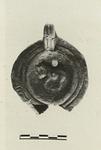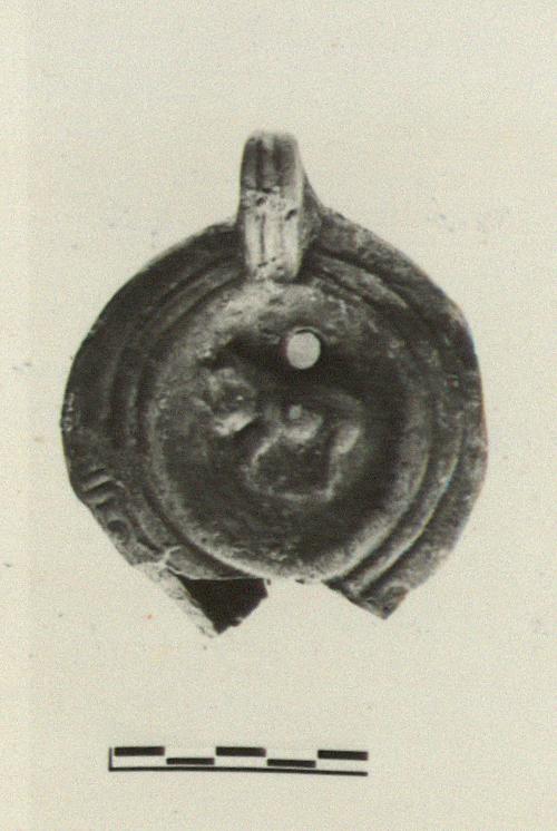 | Description: | Nozzle and some of body missing. On discus, cow left. On rim, two grooves; panels of short strokes and concentric circles. Handle, unpierced, two grooves above and below. On reverse, within two concentric grooves, a palm branch. Dull purplish-brown glaze. Buff clay. Type XXVIII of Corinth collection. | |