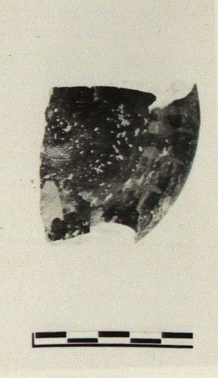 | Description: | A single fragment preserves complete profile and part of nozzle. Thick slightly in turned rim; flat bottom. Unbridged nozzle. Rather thin black glaze except on bottom. Short cross-strokes in added red on top of rim. Pinkish-buff clay. Type 7 of Agora collection. | |